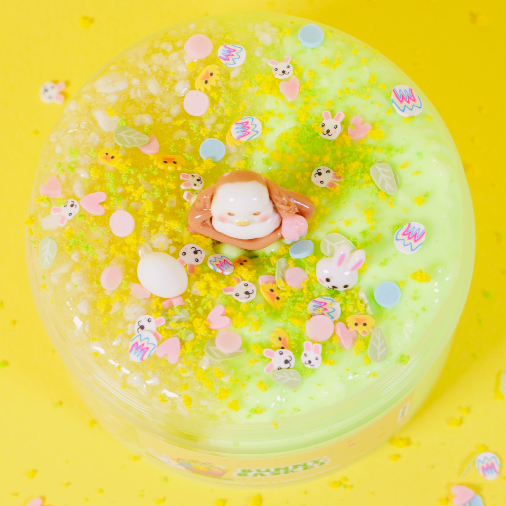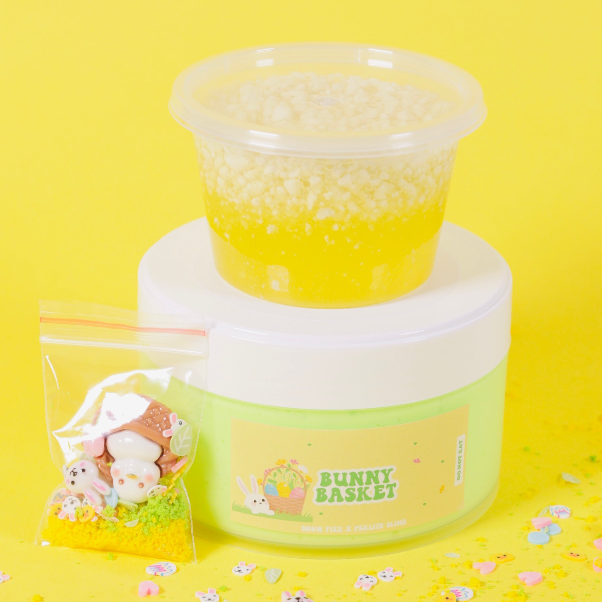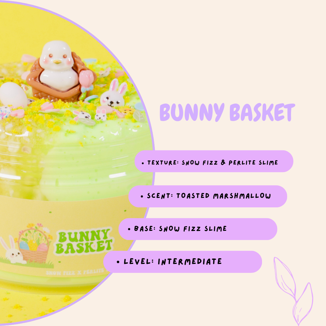 ADD ONS: BASKET CHARMS, BUNNY CHARM, BUNNY CHARM, SPRINKLES, 4OZ CLEAR PERLITE SLIME